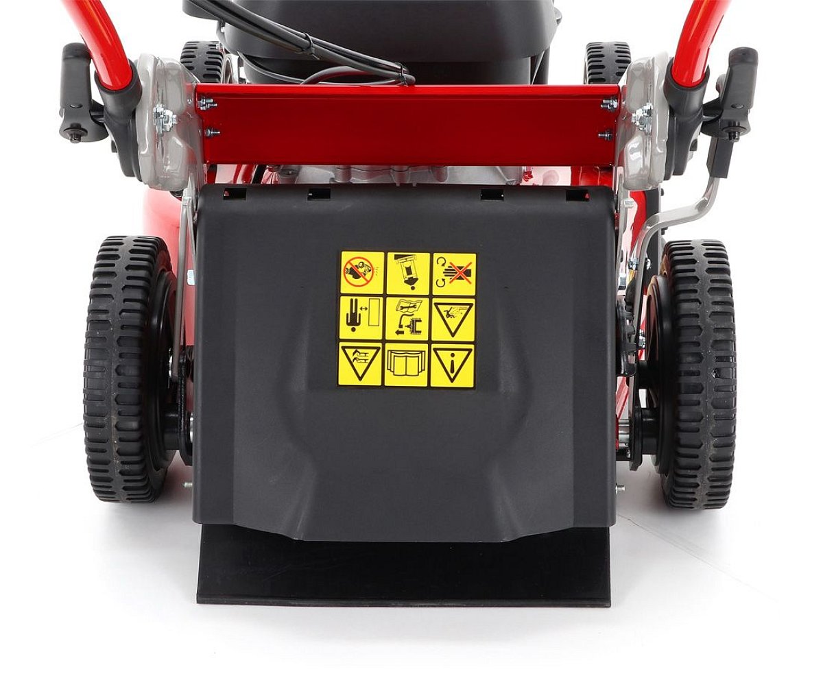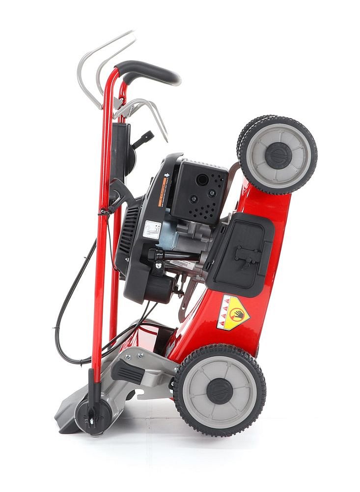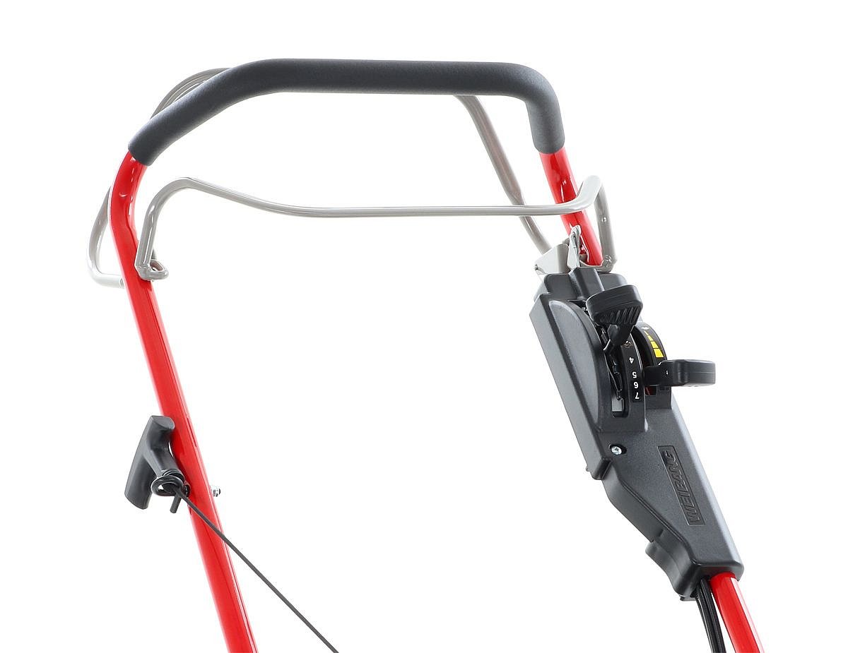 Pogumované sendvičové kolesá sú uložené v obojstranných guličkových ložiskách, centrálne nastavenie výšky kosenia je u tejto značky samozrejmosťou. Veľkým nadštandardom u tejto kosačky je použitá špeciálna trecia spojka na noži kosačky pod unášačom, ktorá je schopná preklzu noža pri narazení do pevnej prekážky. Táto funkcia môže eliminovať škody na kosačke spôsobené nárazom noža do prekážky. Ergonomická rukoväť s ovládacími prvkami otáčok motora a špeciálny povlak na obvode zberného koša, ktorý stimuluje prúd vzduchu, aby sa neprášilo na obsluhu.