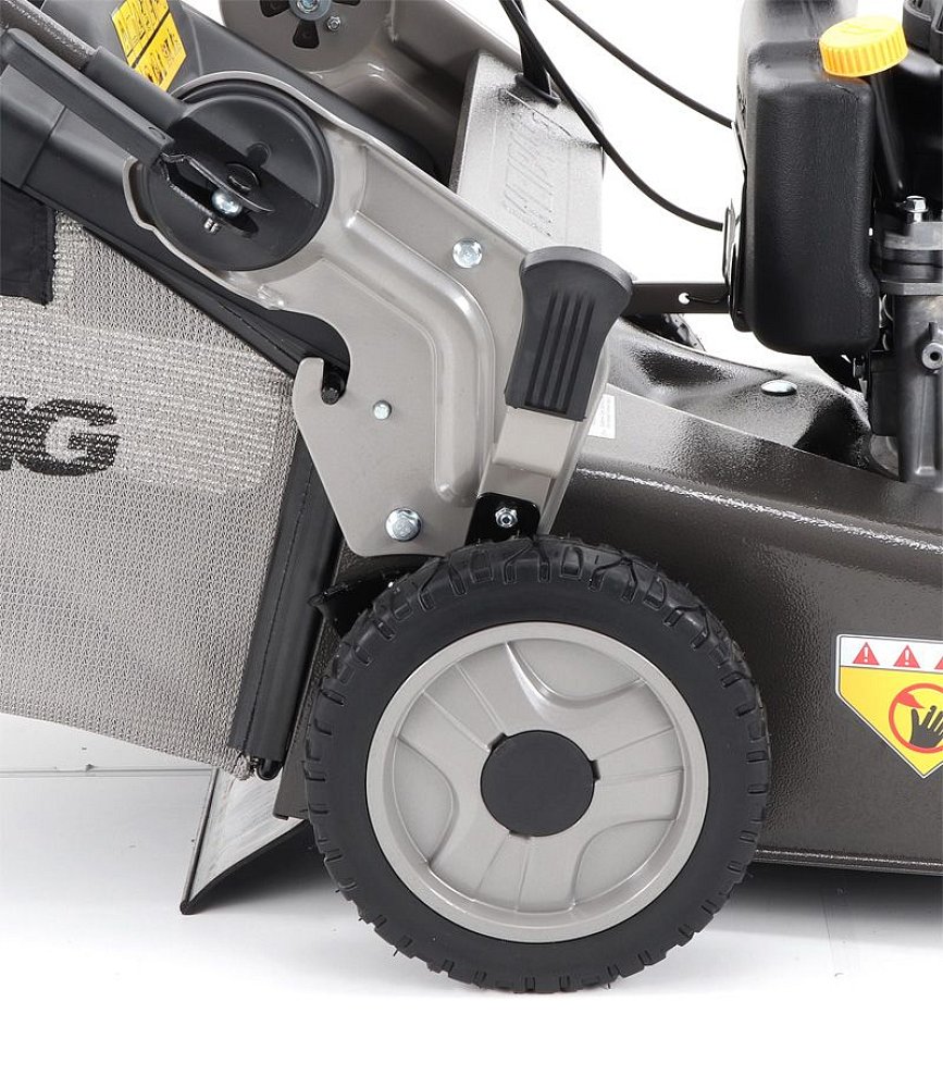 Pogumované sendvičové hliníkové kolesá sú uložené v obojstranných guličkových ložiskách, centrálne nastavenie výšky kosenia je u tejto značky samozrejmosťou. Veľkým nadštandardom u tejto kosačky je použitá špeciálna trecia spojka na noži kosačky pod unášačom, ktorá je schopná preklzu noža pri narazení do pevnej prekážky. Táto funkcia môže eliminovať škody na kosačke spôsobené nárazom noža do prekážky. Ergonomická rukoväť s ovládacími prvkami otáčok motora a špeciálny povlak na obvode zberného koša, ktorý stimuluje prúd vzduchu, aby sa neprášilo na obsluhu.
