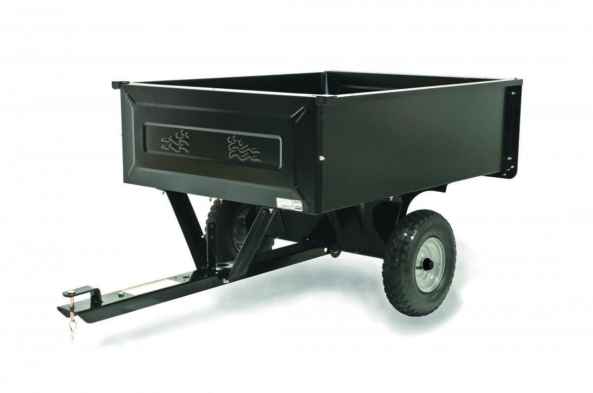 Oceľový príves Cub Cadet s hmotnosťou 159 kg má otváraciu zadnú dosku a mechanizmus na vyklápanie.