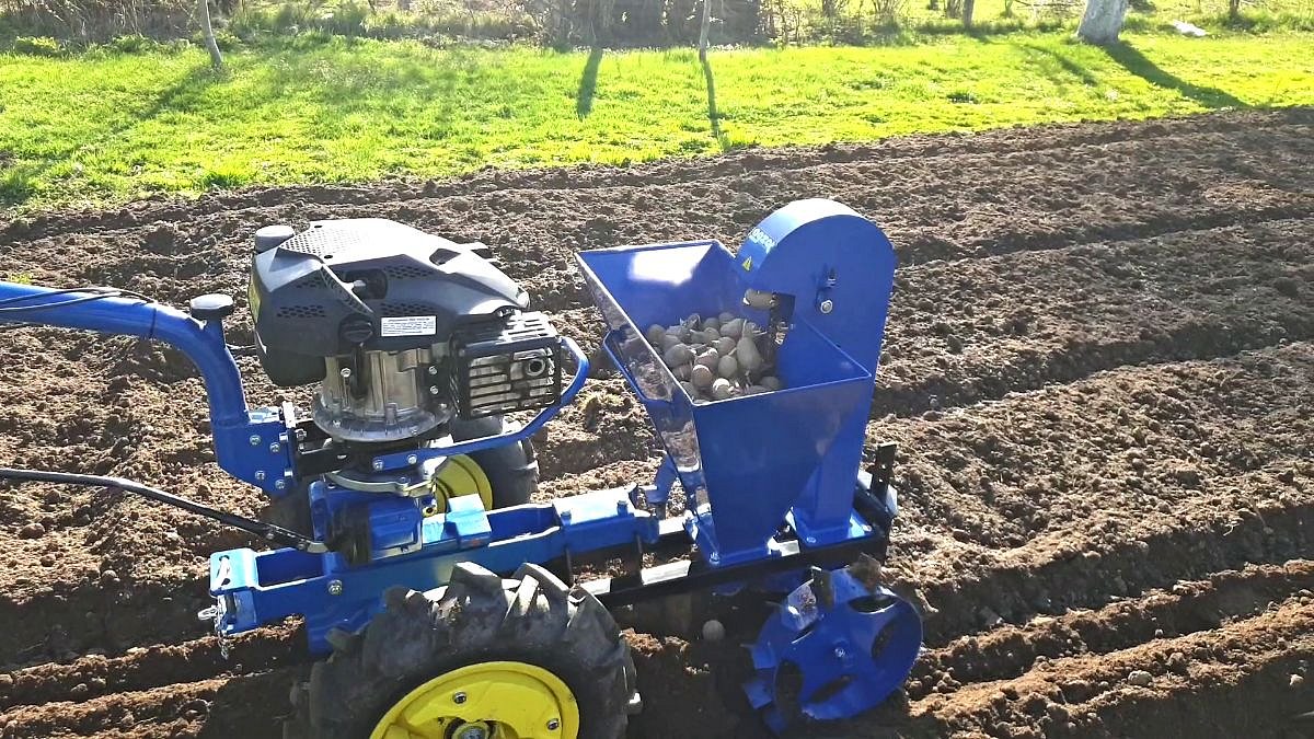 Sadzač vytvára ryhy, ukladá do nich zemiaky každých 26 cm a zahŕňa ich. Sadzač upíname pred malotraktor AGZAT. Hĺbku sadenia i výšku zahrabávania si môžete prispôsobiť výškovým nastavením pluhov. Sadzač zemiakov Vám zjednoduší a urýchli sadenie zemiakov.