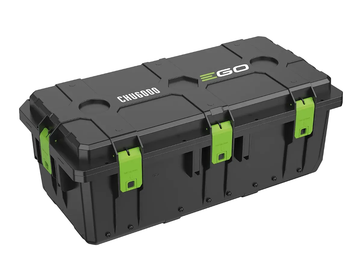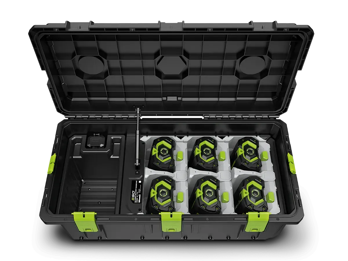 Profesionálný multinabíjací box CHU6000 prináša možnosť uskladniť a súčasne nabíjať akúkoľvek kombináciu až šiestich 56 V batérií EGO, vďaka čomu je ideálnym pomocníkom pre profesionálnych používateľov. Má robustnú konštrukciu odolnú voči nepriazni počasia s odolnými koliečkami pre jednoduchý transport.
