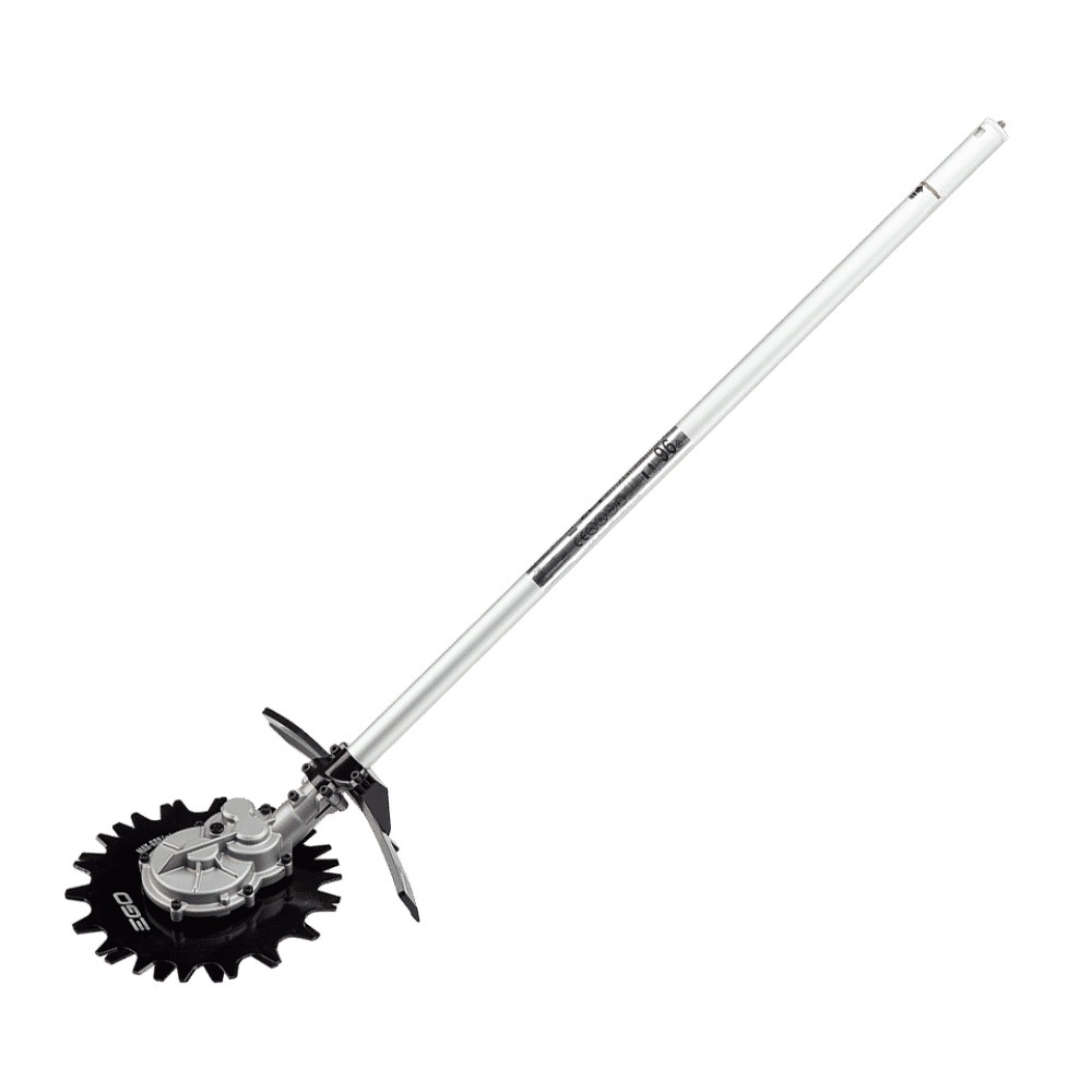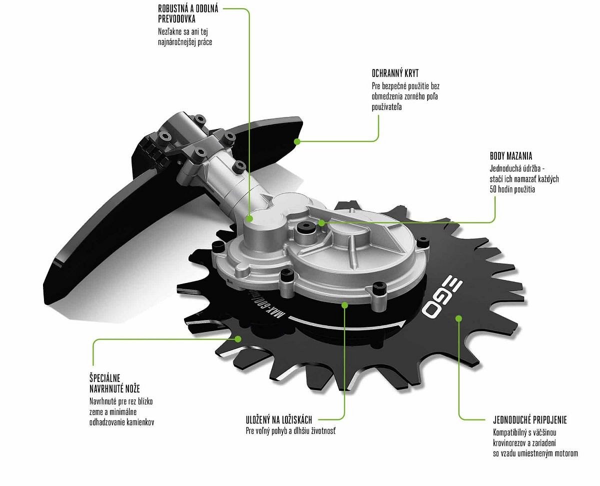 Jeho hlavnou výhodou je protichodná rotácia dvoch nožov s otáčkami len 450 ot/min, vďaka čomu je odhadzovanie kamienkov do veľkej miery eliminované. Vďaka kvalitným samoostriacim nožom si tento nástavec s ľahkosťou poradí s trávou, burinou, machom na betóne, chodníku, alebo na okraji tránika. Vďaka nízkemu profilu prevodovky je možné dosiahnuť aj na ťažko dostupné miesta. Nože sú uložené na ložiskách, čím sa zvyšuje ich životnosť a znižuje poškodenie povrchu chodníka. Tento nástavec je kompatibilný s väčšinou vyžínačov a krovinorezov so vzadu umiestneným motorom, čo z neho robí ideálne riešenie pre komunálne služby.