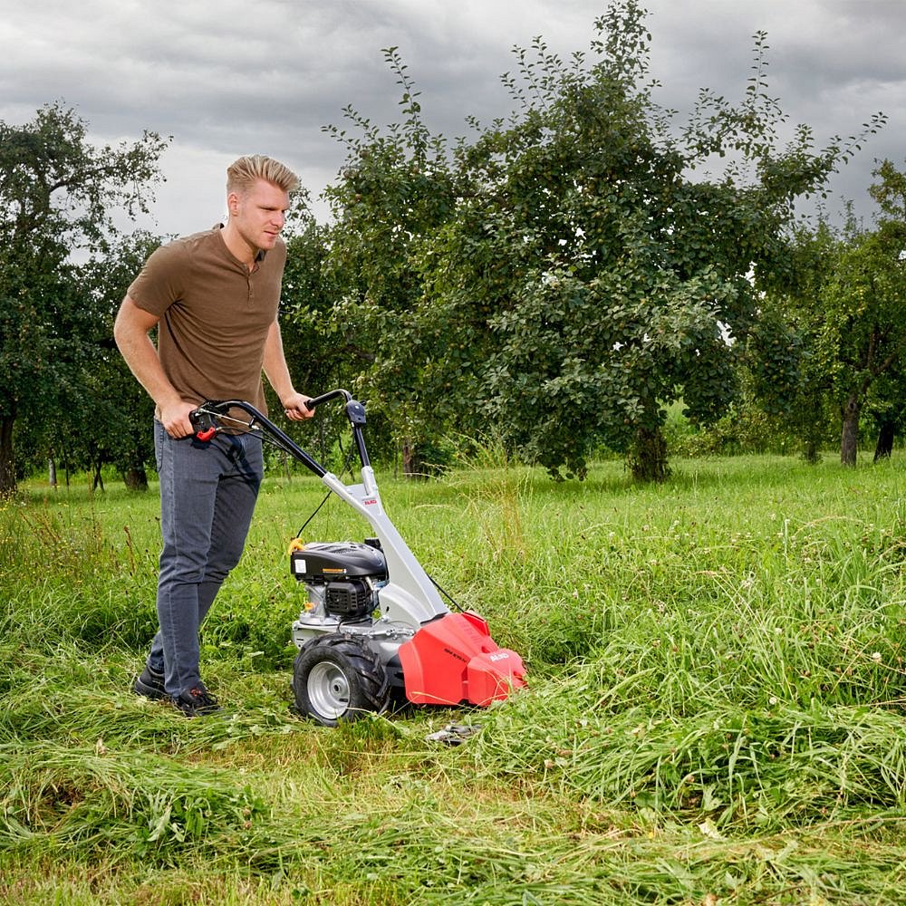Motor zaisťuje, že nože pripojené k žacej lište pracujú rýchlo a rovnomerne - a poháňa pohon kolies (1 prevodový stupeň vpred), ktorý je možné zapnúť a vypnúť pomocou šnekového prevodu. V spojení s výškovo nastaviteľnými, vibráciami tlmenými riadidlami pre dokonalé vedenie zariadenia a 13-palcovými širokými pneumatikami s farmárskym profilom je zaistená optimálna ovládateľnosť v akomkoľvek teréne a na svahoch so sklonom do cca 20°.
