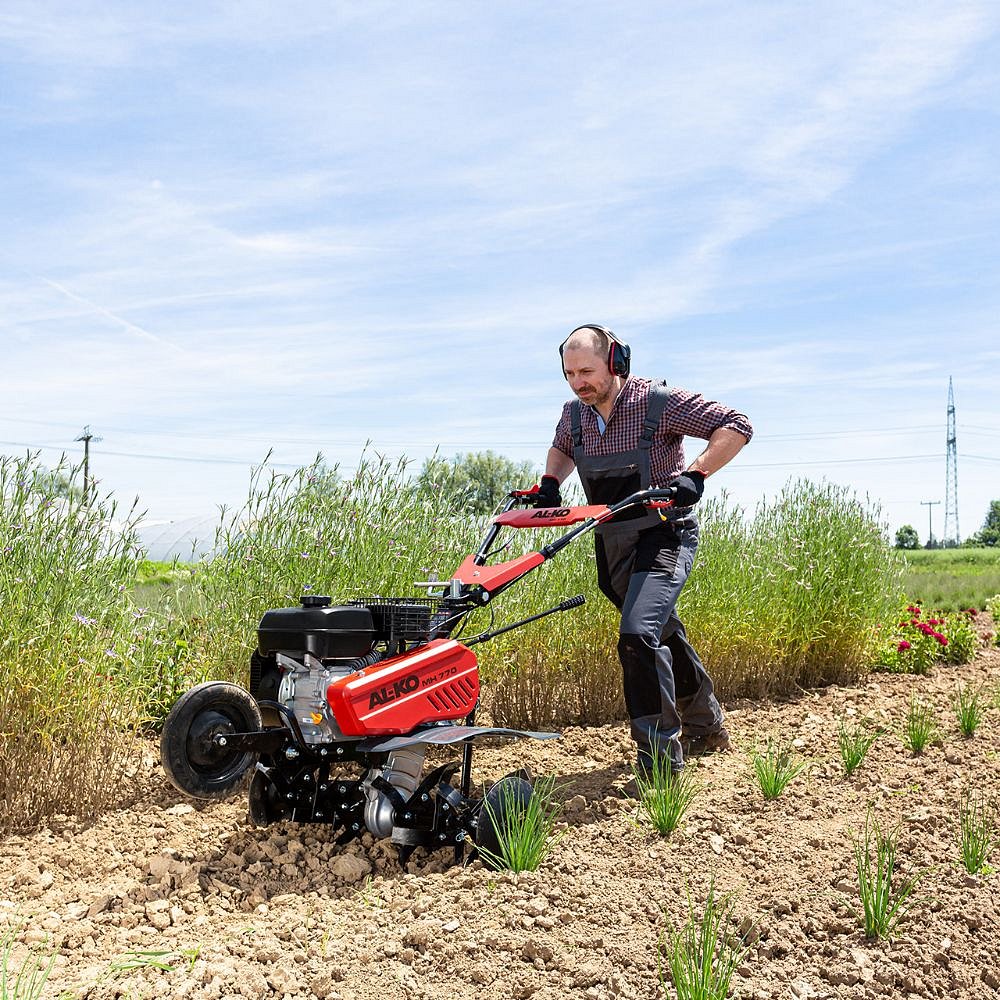 Aktívne pracujúce, špeciálne tvarované štyri nože na každej súprave sú totiž výborne navrhnuté na obrábanie pôdy - a vďaka motoru s výkonom 3,45 kW má model silný ťah aj na ťažkých pôdach. Vodiaca ostroha udržiava náradie na trati.
