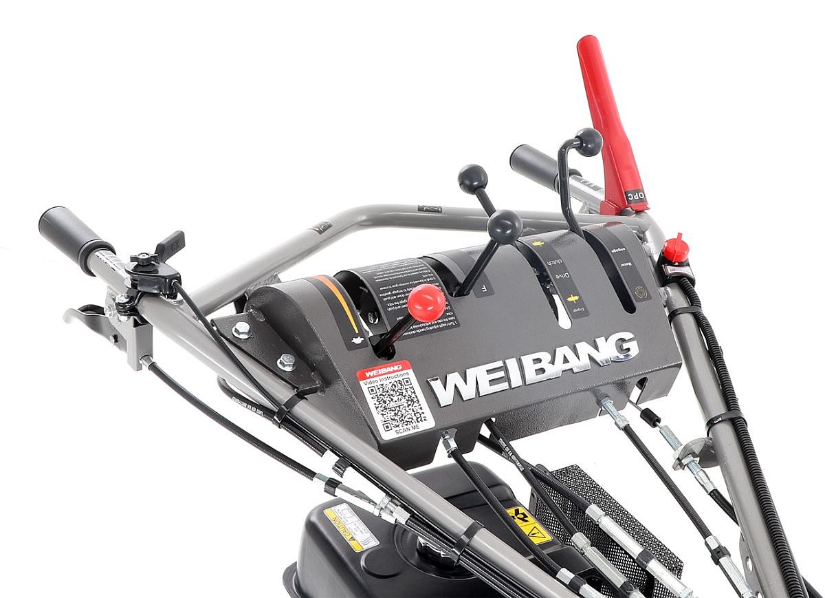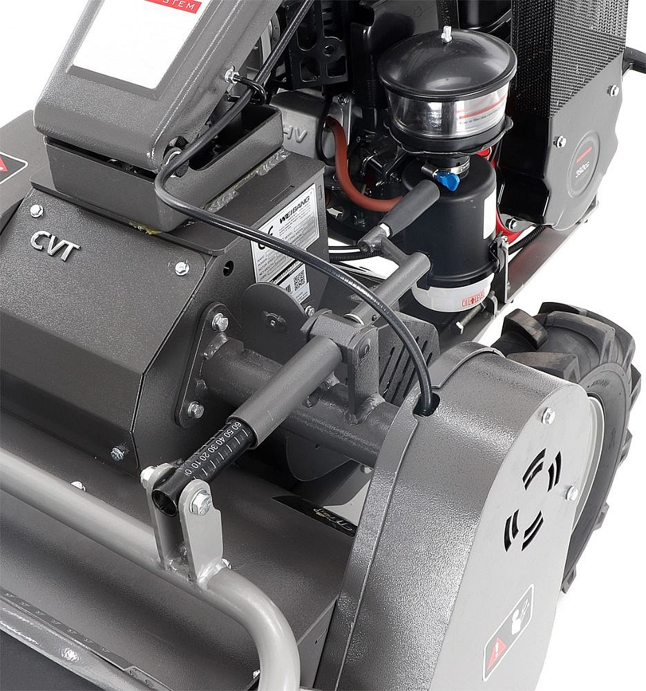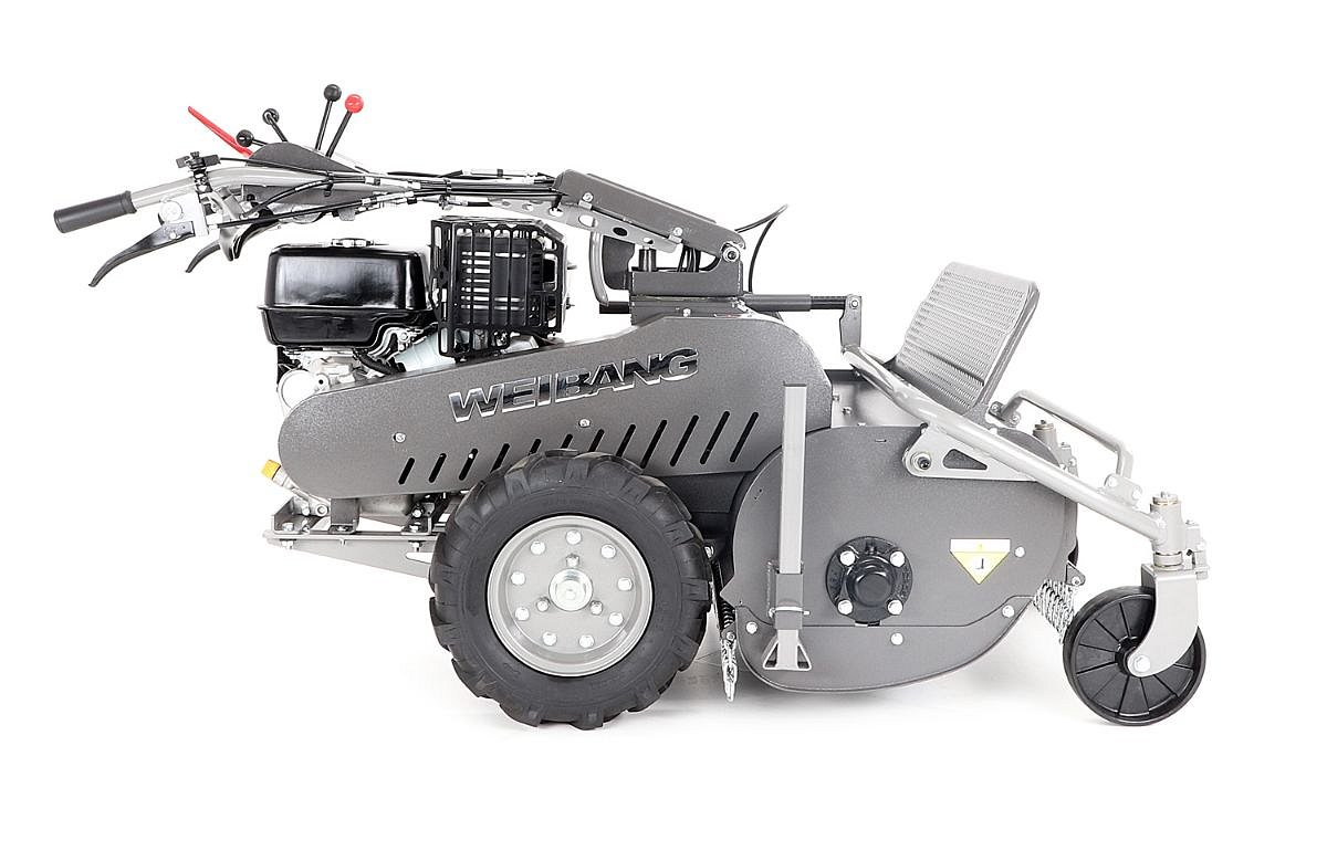 Jednoduchý pohyb v teréne uľahčí nielen kolesá s hrubým dezénom, ale aj pojazd s CVT Weibang prevodovkou . Predné kolesá uložené na otočných čapoch dávajú kosačke skvelú manévrovateľnosť .