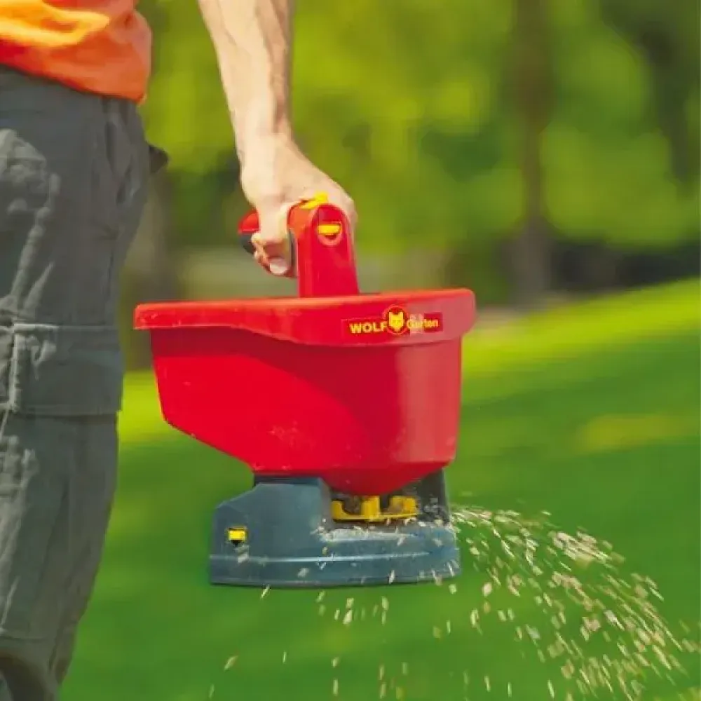 Rozmetadlo Wolf Garten WE-B je vybavené zásobníkom, do ktorého sa nasype požadovaný materiál. Pomocou nastavovača môžete presne regulovať dávkovanie a šírku záberu. Pri chôdzi sa materiál rovnomerne rozmetadlo po ploche.