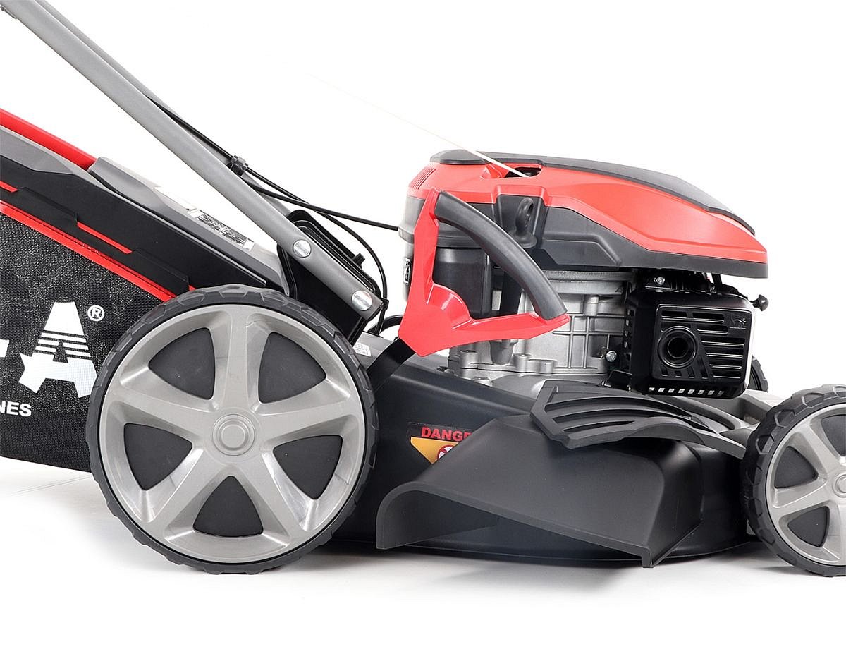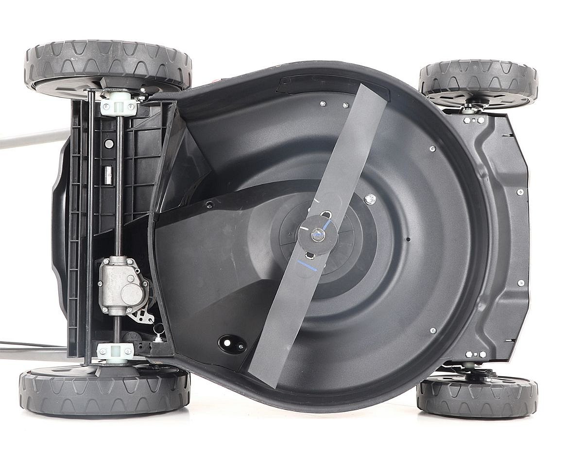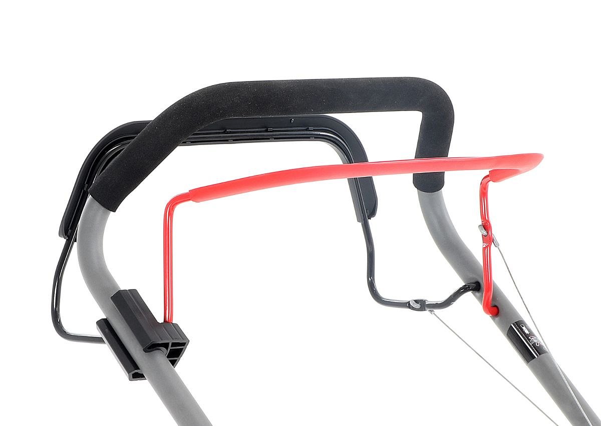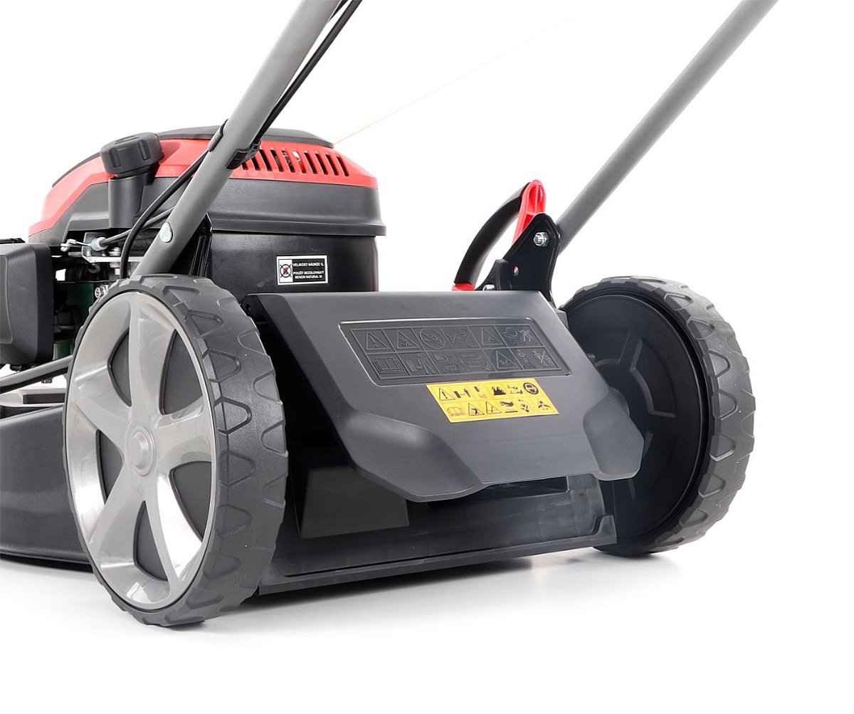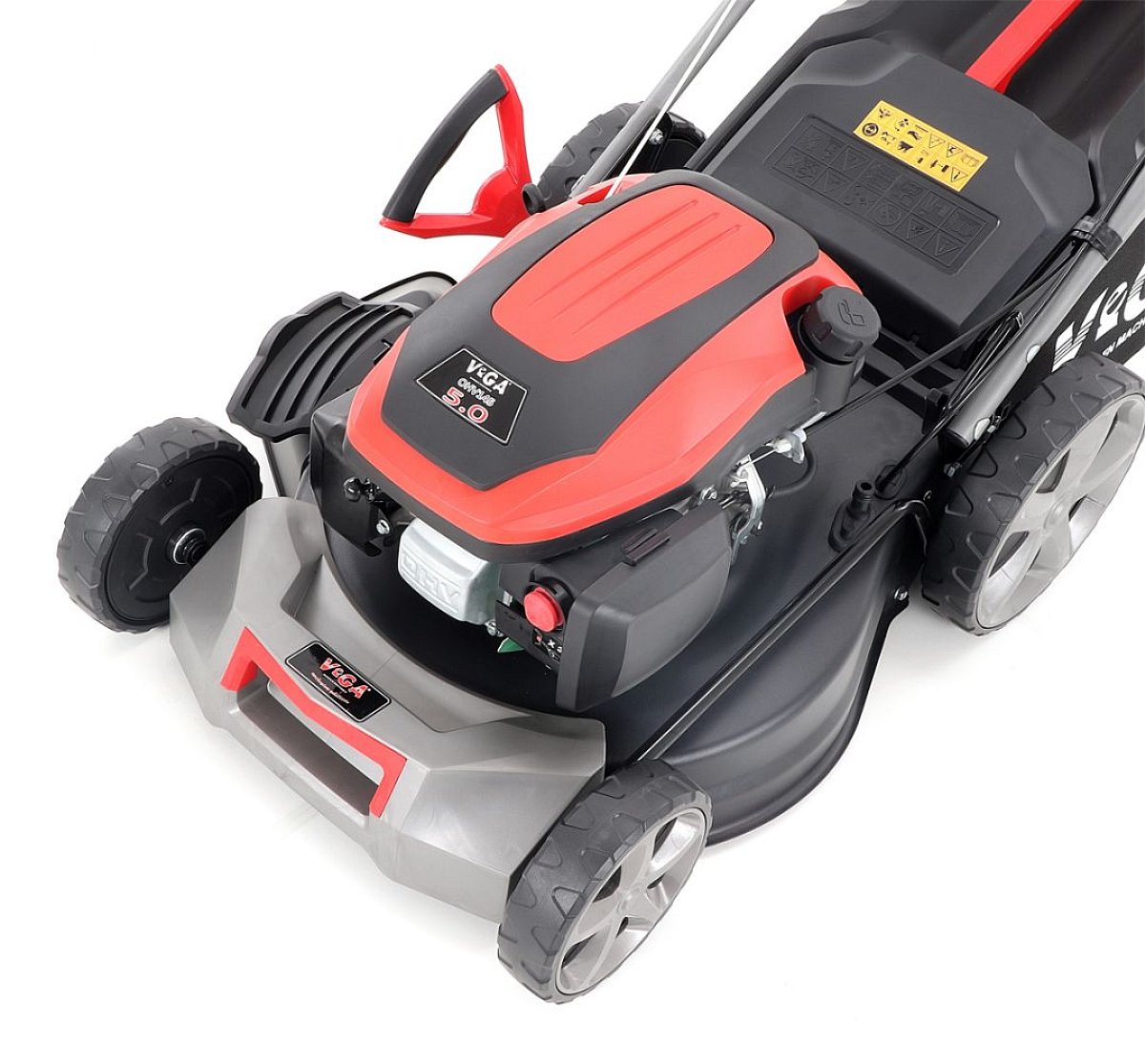 Veľké zadné pojazdové kolesá aj predné kolesá sú uložené v obojstranných guličkových ložiskách, centrálne nastavenie výšky kosenia je u značky VeGA tiež samozrejmosťou, ako ergonomické mäkčené madlo.