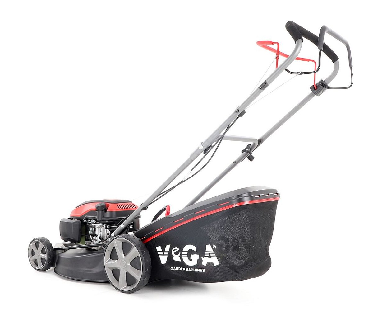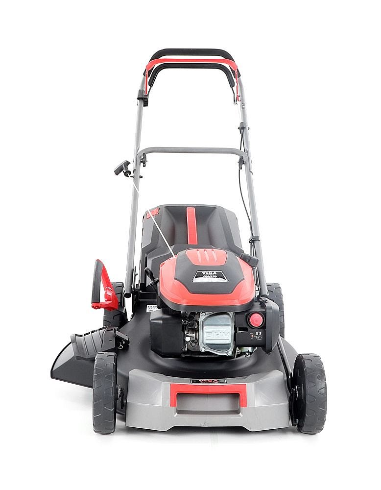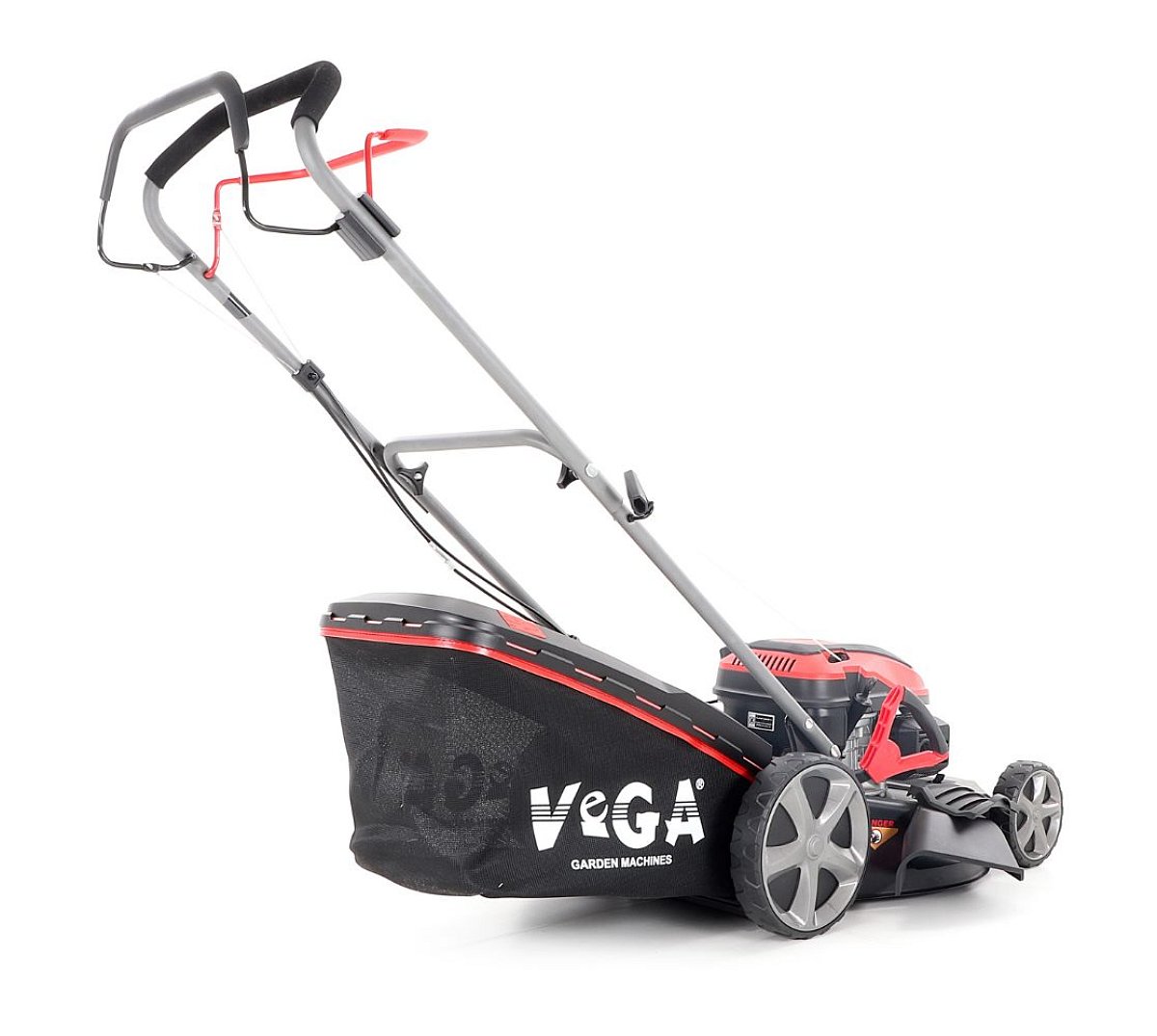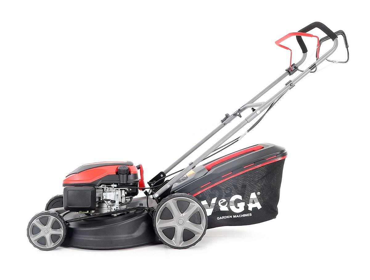 Veľké zadné pojazdové kolesá aj predné kolesá sú uložené v obojstranných guličkových ložiskách, centrálne nastavenie výšky kosenia je u značky VeGA tiež samozrejmosťou, ako ergonomické mäkčené madlo.