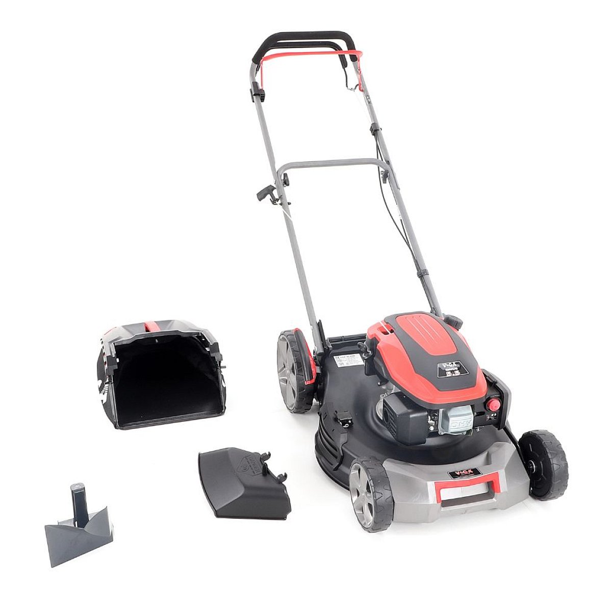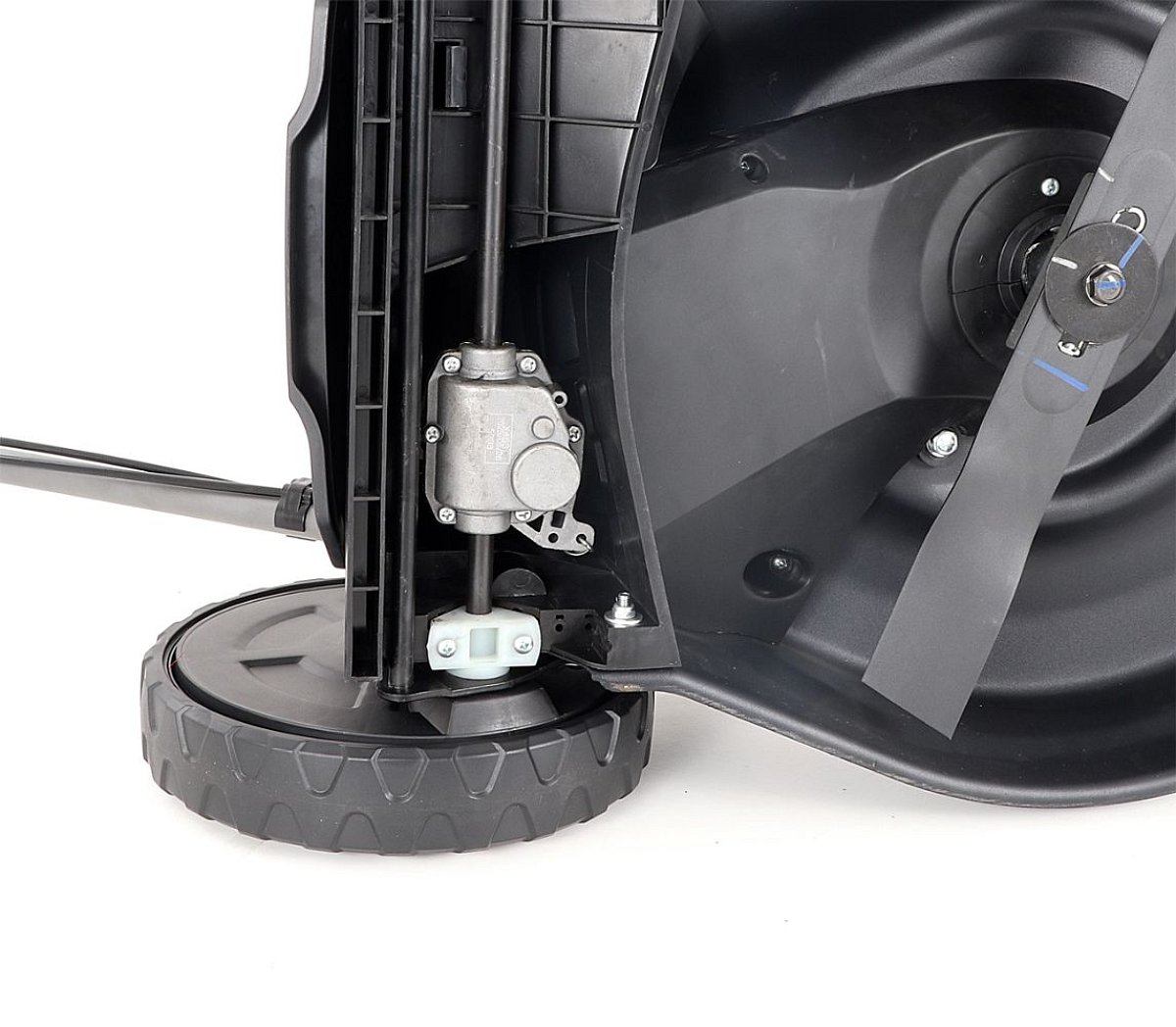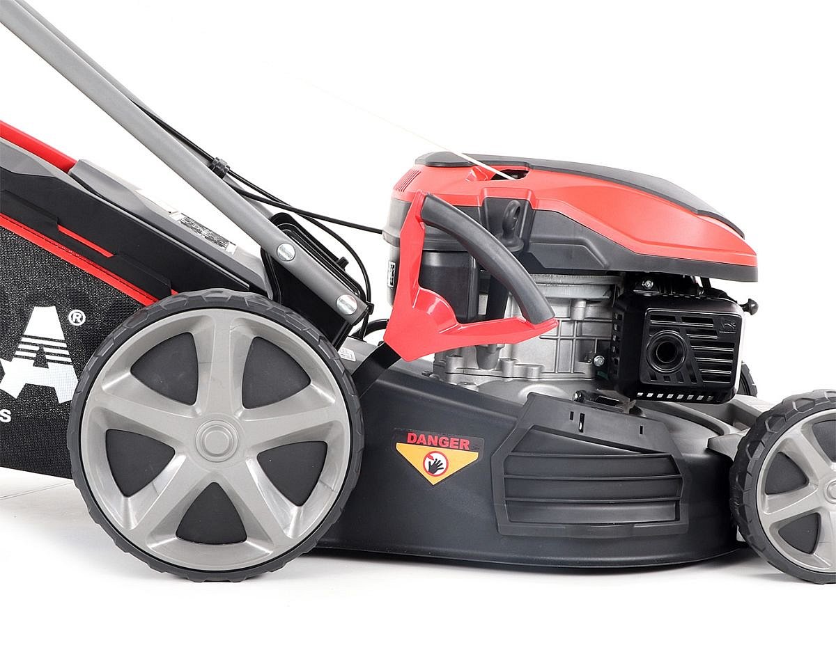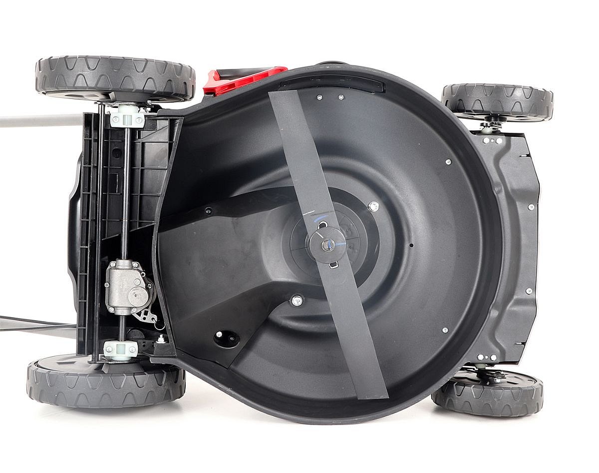 Veľké zadné pojazdové kolesá aj predné kolesá sú uložené v obojstranných guličkových ložiskách, centrálne nastavenie výšky kosenia je u značky VeGA tiež samozrejmosťou, ako ergonomické mäkčené madlo.